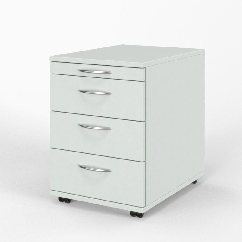 Rollcontainer 1/3/3/3 HE / Tiefe 580 mm, Utensilienauszug, 3 Schubladen aus Holzzargen, fahrbar auf Rollen.