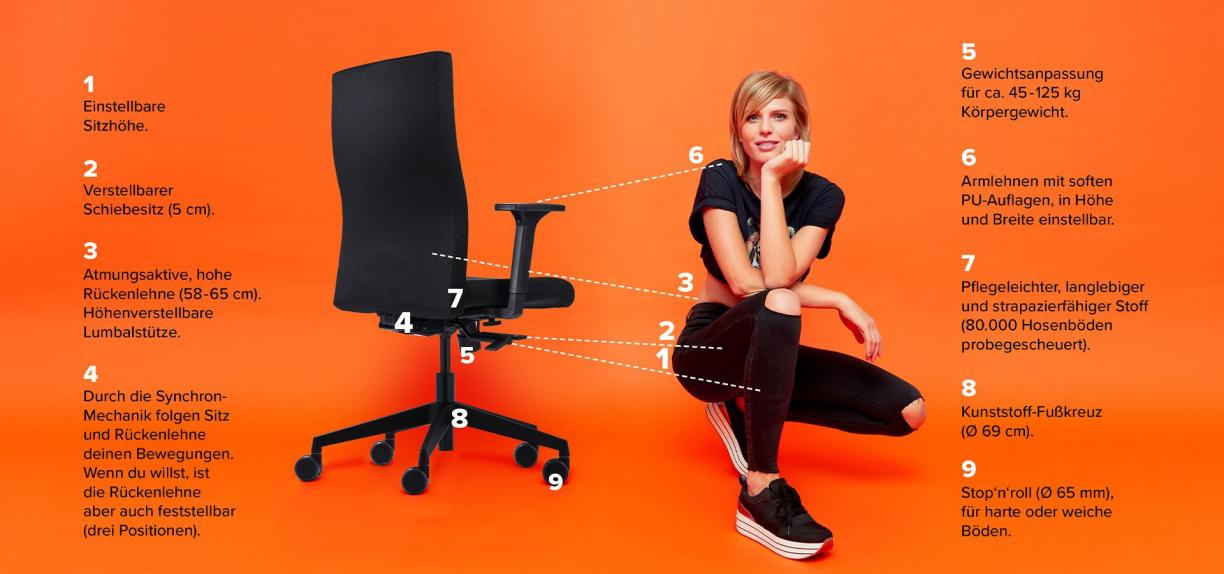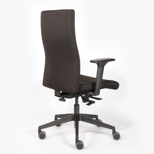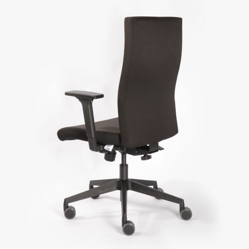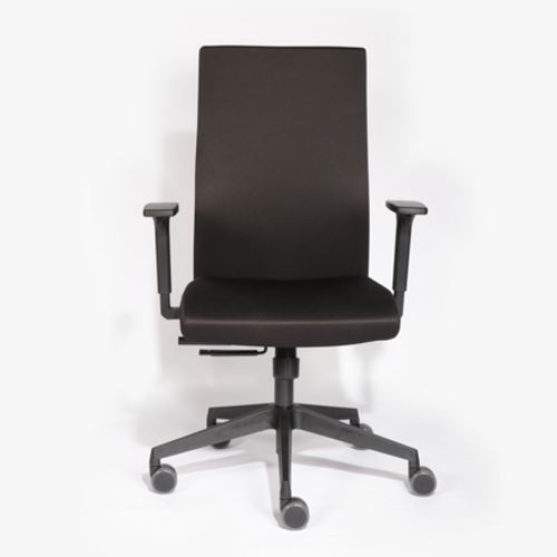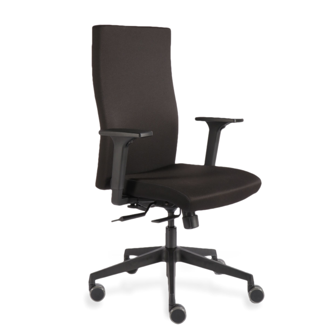Drehstuhl mit komfortabler, höhenverstellbarer Vollpolster-Rückenlehne und 2F-Armlehnen (höhen- u. breitenverstellbar). Universalrollen für alle Böden, Bezug schwarz.