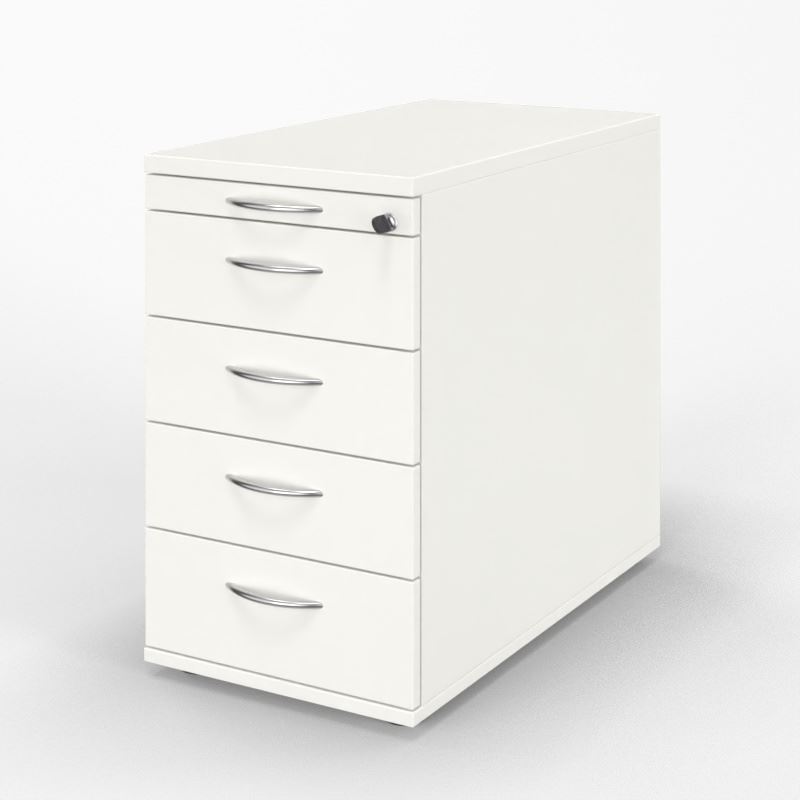 Standcontainer 800 mm tief, Untensilienauszug, 4 ORGA-Schubladen mit "Soft-Stopp", Doppelauszugsperre, höhenjustierbare Stellfüße von 720-760mm und Schloß mit Wechselzylinder.