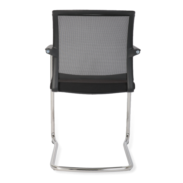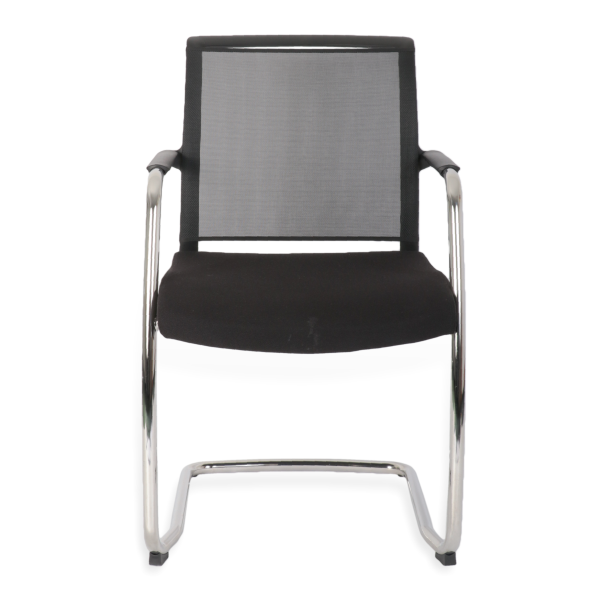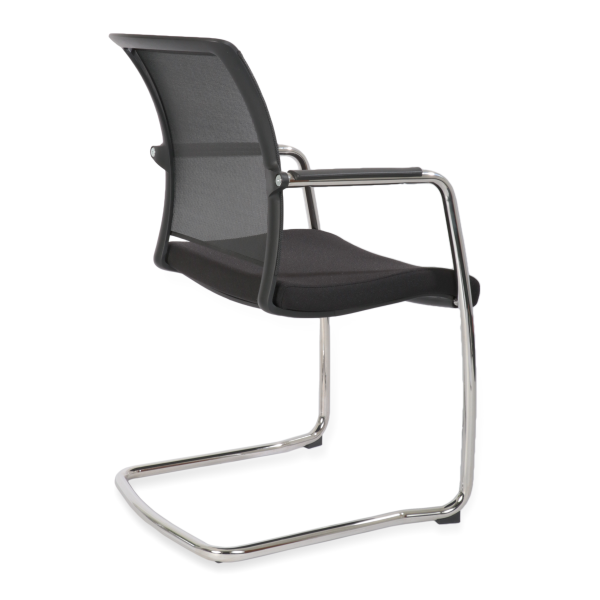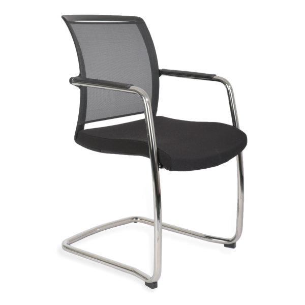 Besucher- und Besprechungssessel mit stabilem Freischwingergestell, nach vorne stapelbar bis 4 Stück, aus verchromten Stahlrohr ( Ø 25 mm). Standardmäßig ausgestattet mit Armauflagen aus Kunststoff (Schwarz) . Rückenlehnenrahmen aus hochwertigem Kunststoff mit Standard-Netzbespannung. Sitzfläche als Vollpolster ausgebildet mit genähtem Boden.